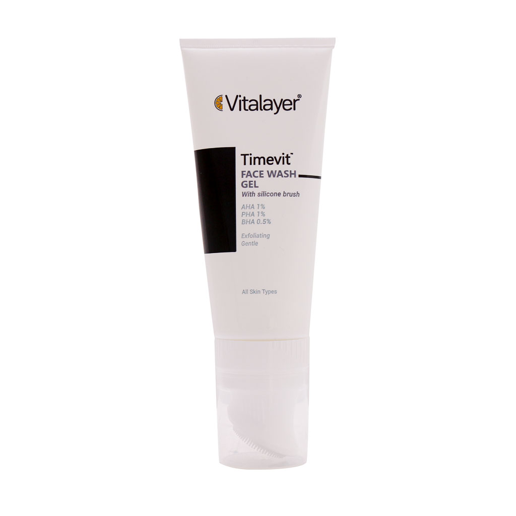 ژل شستشوی صورت تایم ویت ویتالیر حاوی سورفکتانتهای ملایم غیر صابونی و اسیدهای PHA، AHA و BHA با خاصیت لایه برداری ملایم است. این محصول به گونهای فرموله شده تا حتی برای افراد با پوست حساس و خشک نیز قابلیت استفاده داشته باشد. ژل شستشوی صورت تایم ویت ویتالایر باعث لایه برداری پوست و از بین رفتن سلولهای مرده میشود. این ویژگی کاهش چین و چروک پوست، افزایش یکنواختی و روشن کنندگی صورت را به دنبال خواهد داشت. دو ترکیب آلانتوئین و نیاسینامید به کار رفته در این محصول نیز با خاصیت ضد التهابی به بهبود شرایط پوست کمک نموده و اثر مرطوب کنندگی بالایی دارند. ژل شستشوی صورت توانسته توجه مصرف کنندگان را جلب نماید چرا که استفاده از محصول بسیار آسان و کاربردی است.