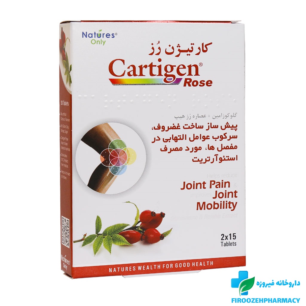 آرتروز یک بیماری مفصلی دژنراتیو است که باعث تخریب پیشرونده مزمن غضروف میشود و نهایتا عامل ایجاد درجات مختلف نرمی، شکنندگی، تخریب و فرسایش میشود. قرص کارتیژن رز نیچرز اونلی حاوی گلوکوزامین سولفات پتاسیم کلراید و عصاره رز هیپ بوده که به درمان آرتروز و همین طور کاهش درد و التهابات ناشی از آن کمک موثری میکند.