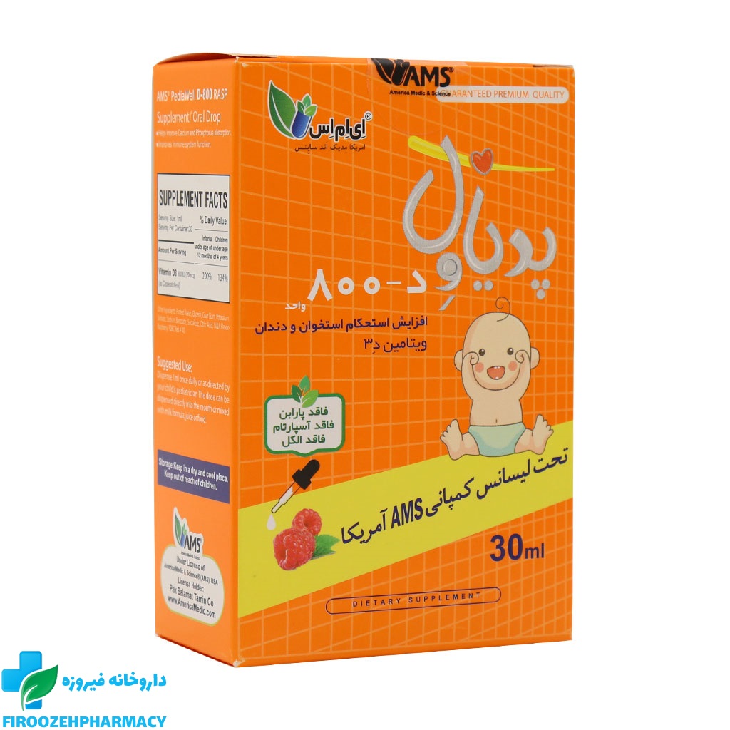 ویتامین د3 از جمله ویتامین‌های محلول در چربی است که کودکان به آن نیاز دارند. قطره خوراکی پدیاول د 800 واحد ای ام اس مکملی منحصر به فرد برای جلوگیری از نرمی استخوان و افزایش استحکام استخوان و دندان است. این مکمل به بهبود رشد کودکان و تقویت سیستم ایمنی بدن آنها کمک می‌کند. همچنین باعث جذب بهتر کلسیم و فسفر در بدن می‌شود. این قطره خوراکی تحت لیسانس کمپانی AMS آمریکا و با طعم مطلوب تمشک به بازار عرضه شده است.