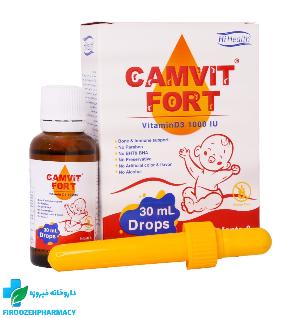 قطره کامویت فورت های هلث حاوی 1000 واحد ویتامین D3 (کوله کلسی فرول) بوده که یک ویتامین محلول در چربی است و به طور طبیعی در بدن در معرض نور خورشید ساخته میشود. ویتامین د3 با افزایش جذب کلسیم و فسفر باعث بهبود عملکرد سیستم ایمنی میشود و برای پیشگیری از پوکی استخوانها و دندانها استفاده میشود.