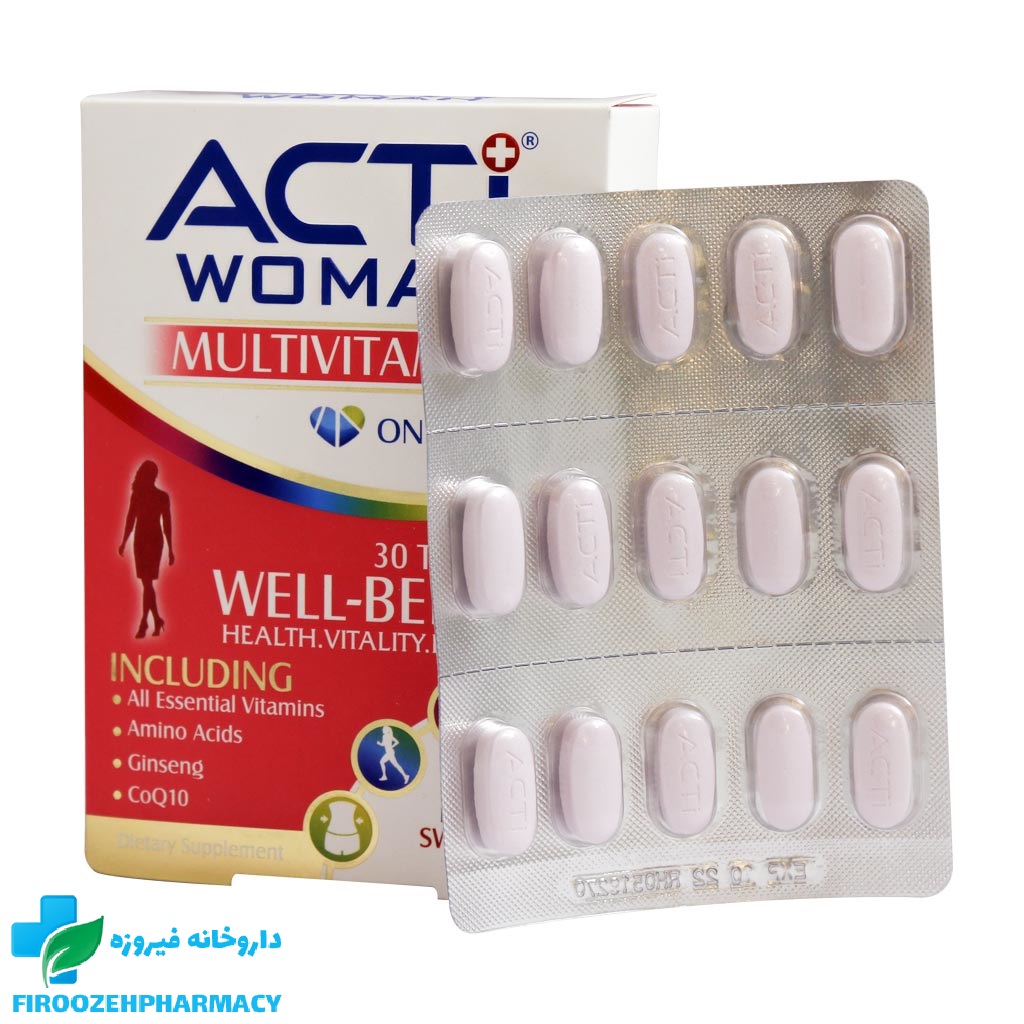 اکتی ومن یک مولتی ویتامین- مینرال است که شامل 31 ماده مغذی جهت استفاده روزانه خانمها است. این مکمل دارای تمامی ویتامینهای محلول در چربی، محلول در آب و مواد معدنی دیگر است. تمامی این ترکیبات برای استفاده روزانه جهت برآورده کردن نیازهای بدن به کار میروند. از ویژگیهای اصلی acti woman کمک به پیشگیری و کاهش علائم ناشی از سندروم پیش از قاعدگی یعنی pms بوده که در کاهش اسپاسم و تغییرات خلق و خو بسیار تاثیرگذار است. این مکمل همچنین در حفظ سلامت پوست، مو و ناخن تاثیر دارد.
