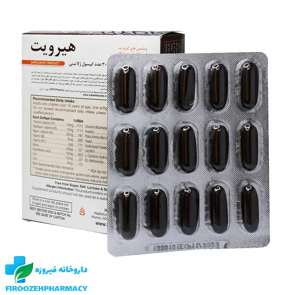 هیرویت نوعی قرص تقویت مو است که در این سال‌ها نگاه‌های بسیاری را به خود جذب کرده است. قرص هیرویت حاوی ویتامین‌ها، مواد معدنی، پابا، اسیدهای آمینه، مخمر، اینوزیتول و … است. قرص هیرویت برای بهبود ریزش مو، افزایش درخشندگی و ضخامت تار مو و حفظ سلامت پوست و ناخن‌ها مورد استفاده قرار می‌گیرد. هیرویت در افراد بالای 16 سال قابل مصرف بوده و فاقد لاکتوز، شکر، نمک و نشاسته است. قرص هرویت به طور خاص برای کسانی که از ریزش مو، ضعف و شکنندگی موها رنج می‌برند، توصیه می‌شود.