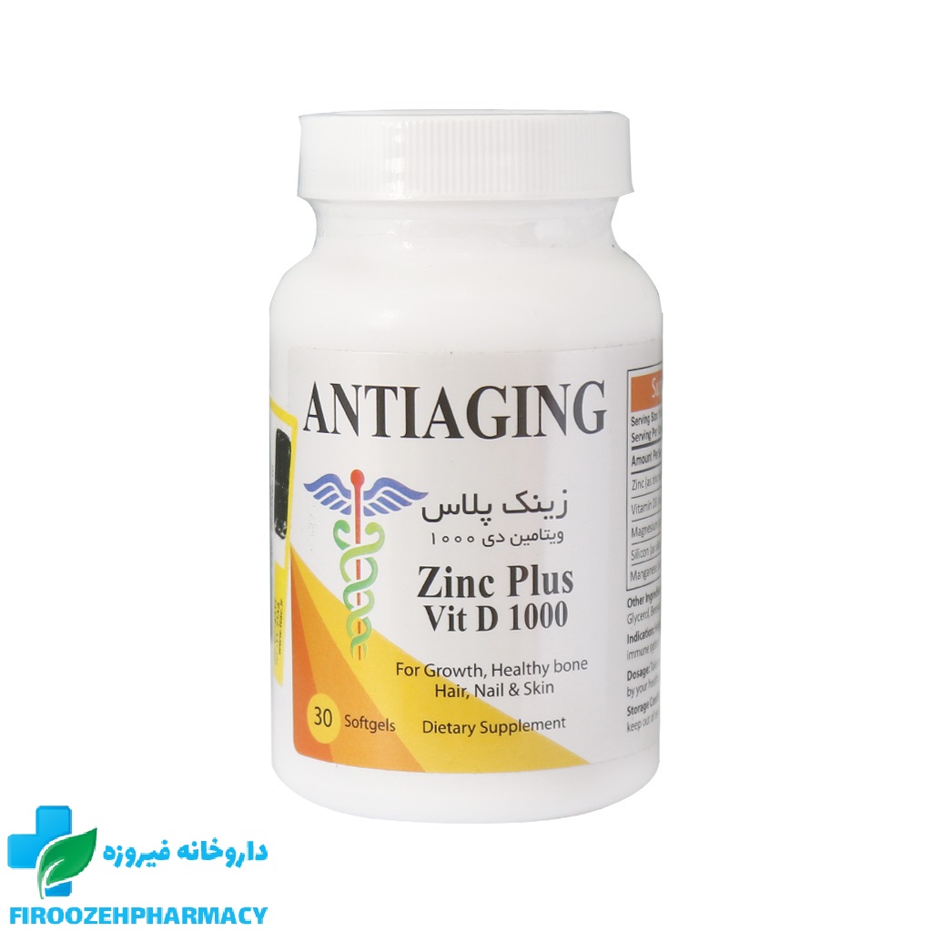سافت ژل زینک پلاس ویتامین D 1000 آنتی ایجینگ مکملی منحصر به فرد برای تقویت سیستم ایمنی بدن، سلامت مو، استخوان و ناخن است. این مکمل به دلیل داشتن زینک از ریزش مو جلوگیری میکند. این قرص زینک پلاس با افزایش جذب کلسیم از پوکی استخوان جلوگیری کرده و در تسکین درد پشت، بهبود ضعف و درد عضلانی موثر است.