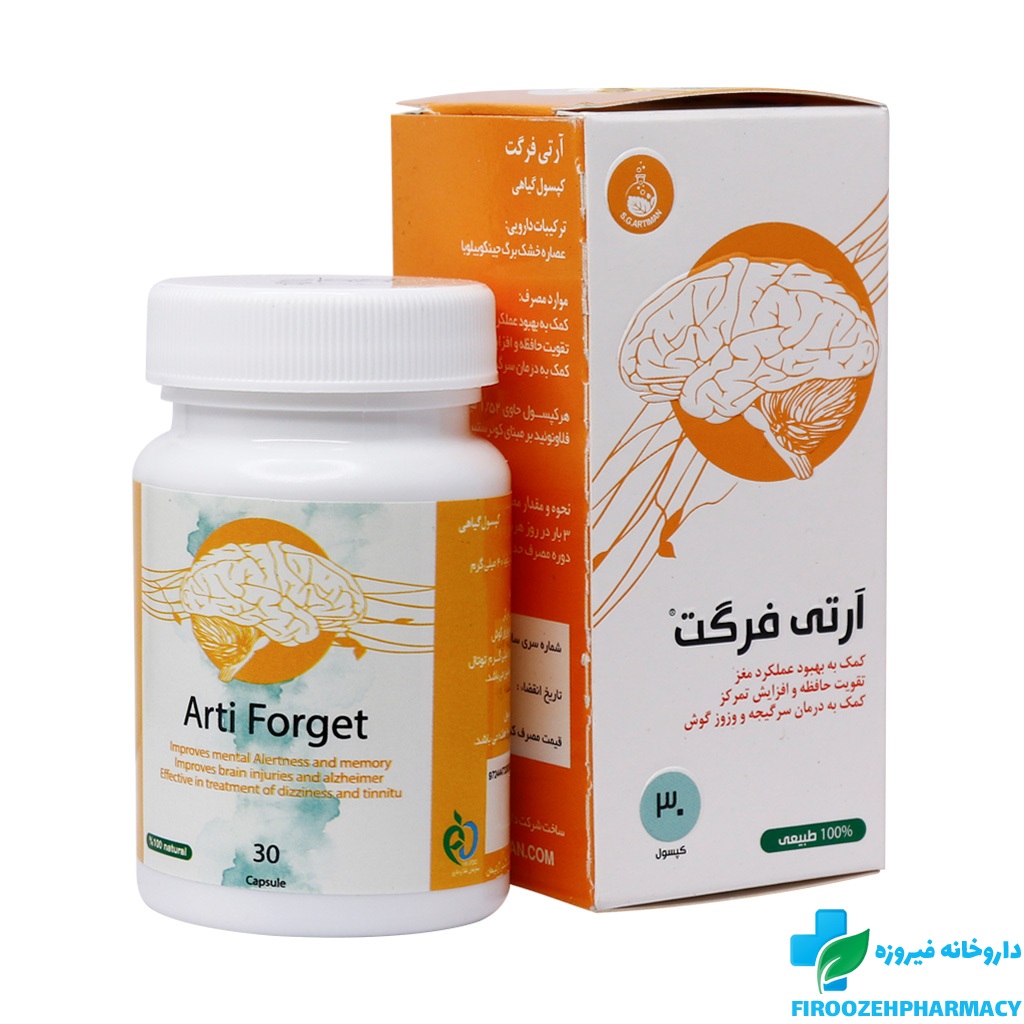 کپسول آرتی فرگت سلامت گستر آرتیمان حاوی عصاره خشک گیاه جینکوبیلوبا بوده که از زوال عقل پیشگیری میکند و به بهبود عملکرد مغز کمک میکند. مطالعات دانشمندان حاکی از آن است که استفاده دارویی از این گیاه موجب توسعه عملکردهای مختلف دستگاه عصبی مرکزی مثل حافظه کوتاه مدت، تمرکز و هوشیاری میشود. شما میتوانید از قرص Arti Forget برای تقویت حافظه و تمرکز، جلوگیری از آلزایمر در سالمندان بهره ببرید. قرص آرتی فرگت بهترین قرص تقویت حافظه و تمرکز به شمار میآید.