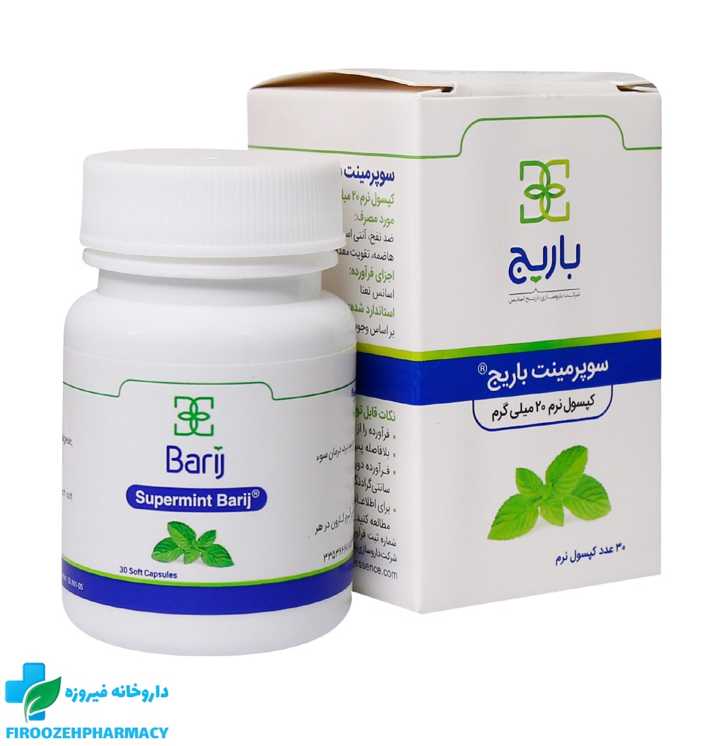 کپسول نرم سوپرمینت ۲۰ میلی گرم باریج اسانس برای درمان مشکلات سیستم گوارشی از جمله نفح معده، سوء هاضمه و زخم معده موثر بوده و همچنین موجب مهار درد التهاب، انقباضات عضلات صاف ایزوله (آنتی اسپاسمودیک) و تقویت معده می گردد.